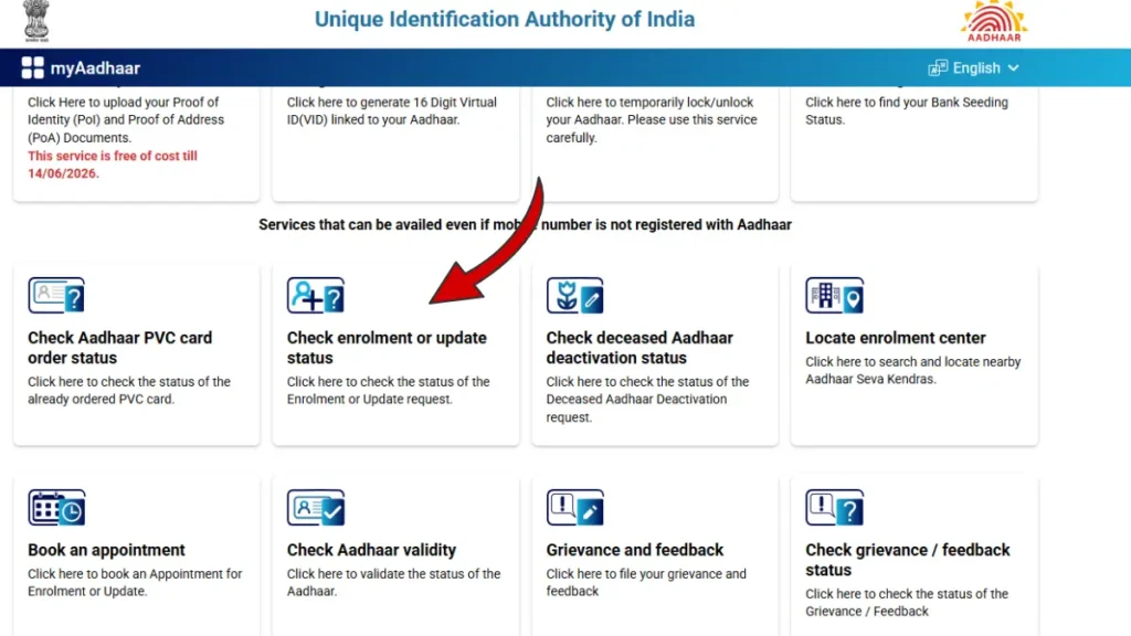- Visit 👉 https://myaadhaar.uidai.gov.in/ and click on Check Enrolment & Update Status option.