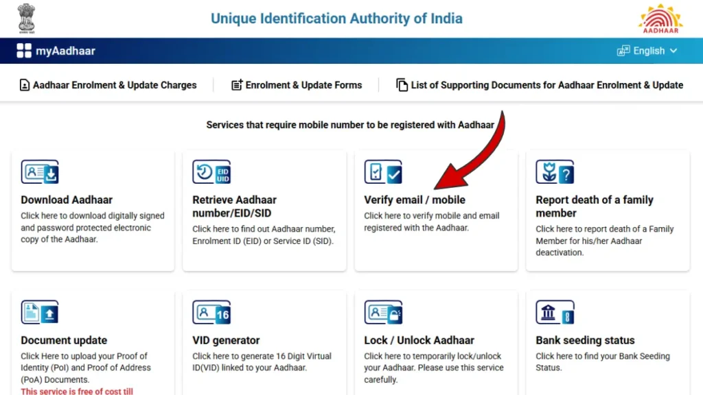 | Mobile Number Update | OTP + Biometric Verification | No document required (verified at Aadhaar centre) |